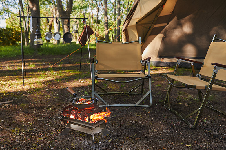 フライパン調理をしながら横でお湯が沸かせる。五徳を外せば焚き火台としても楽しめます。
